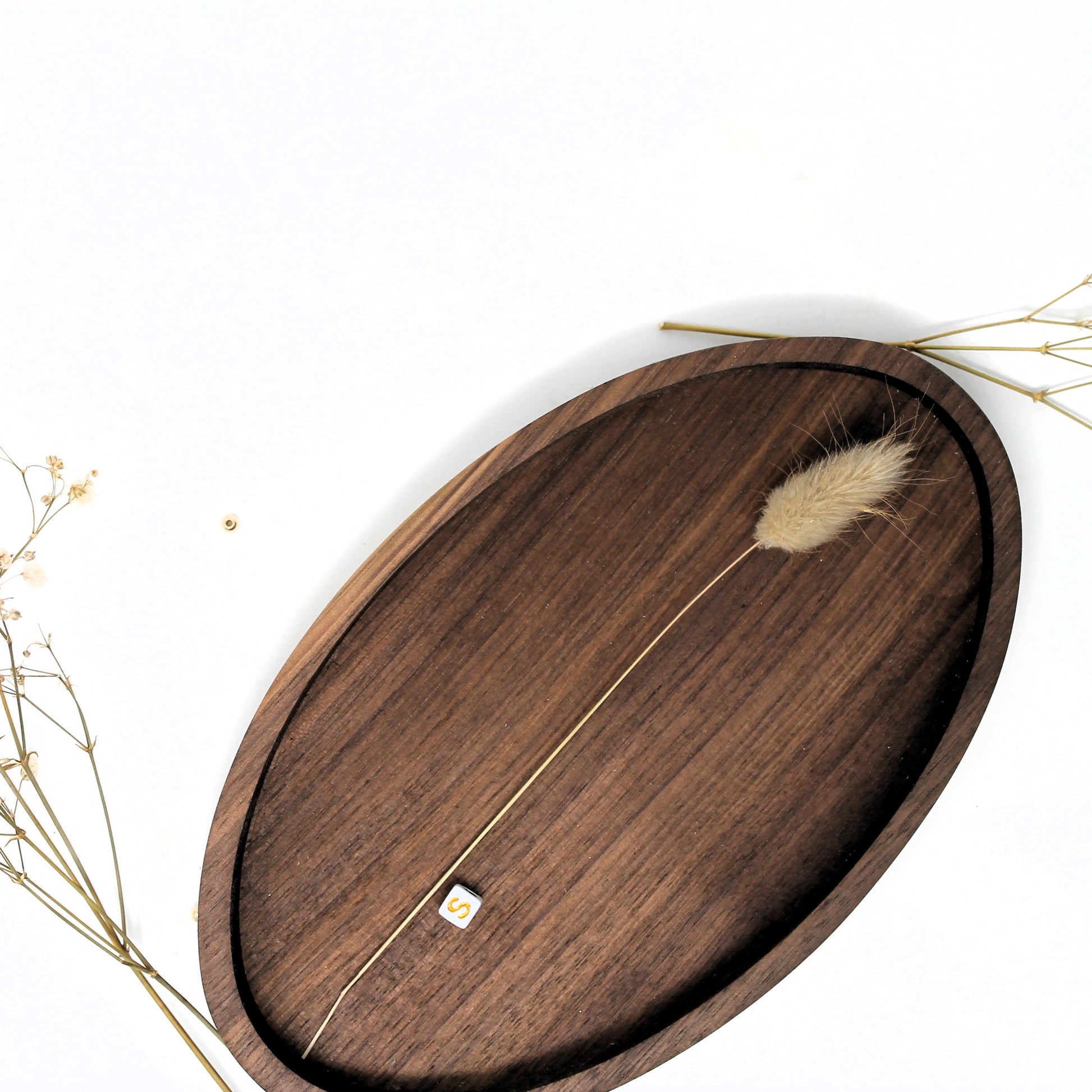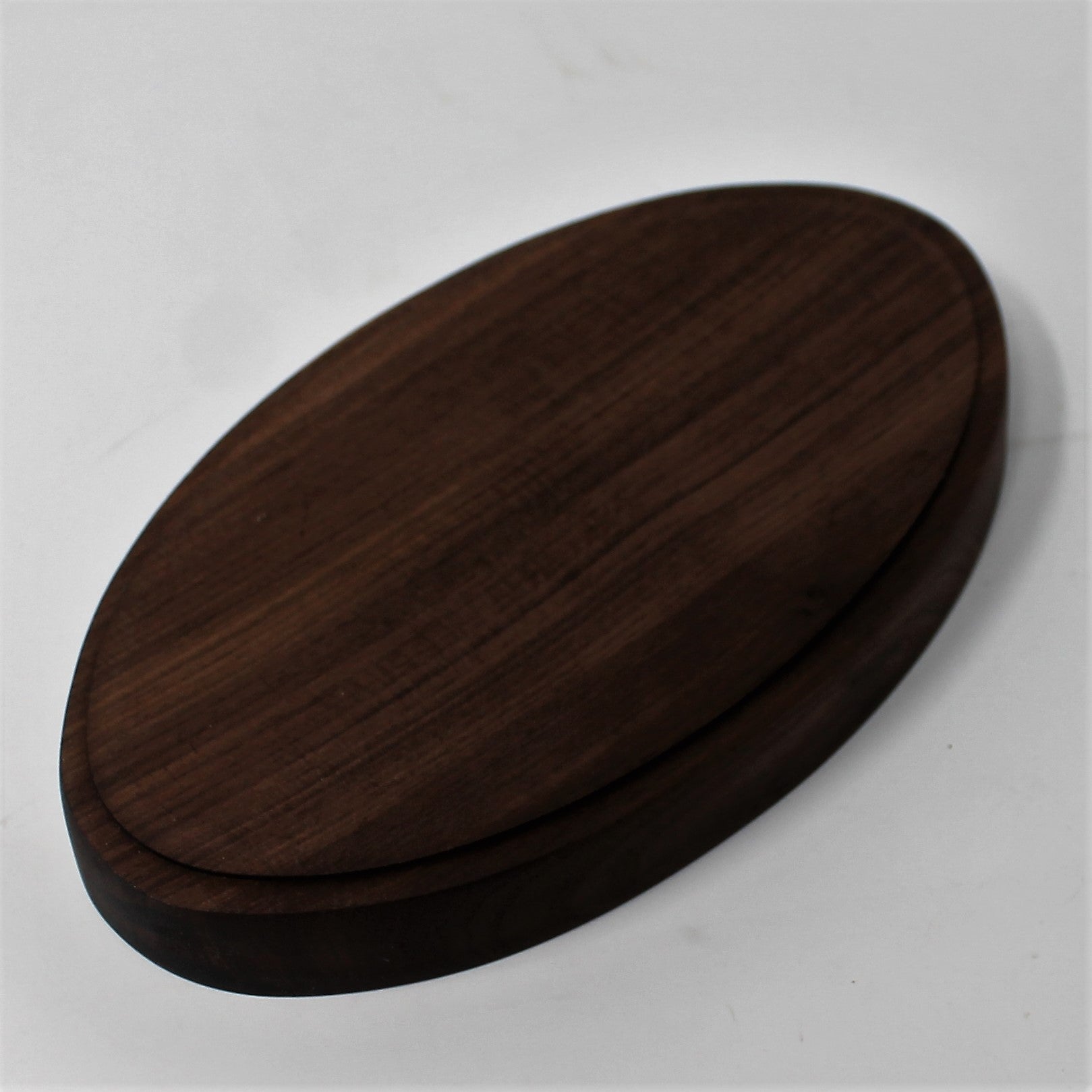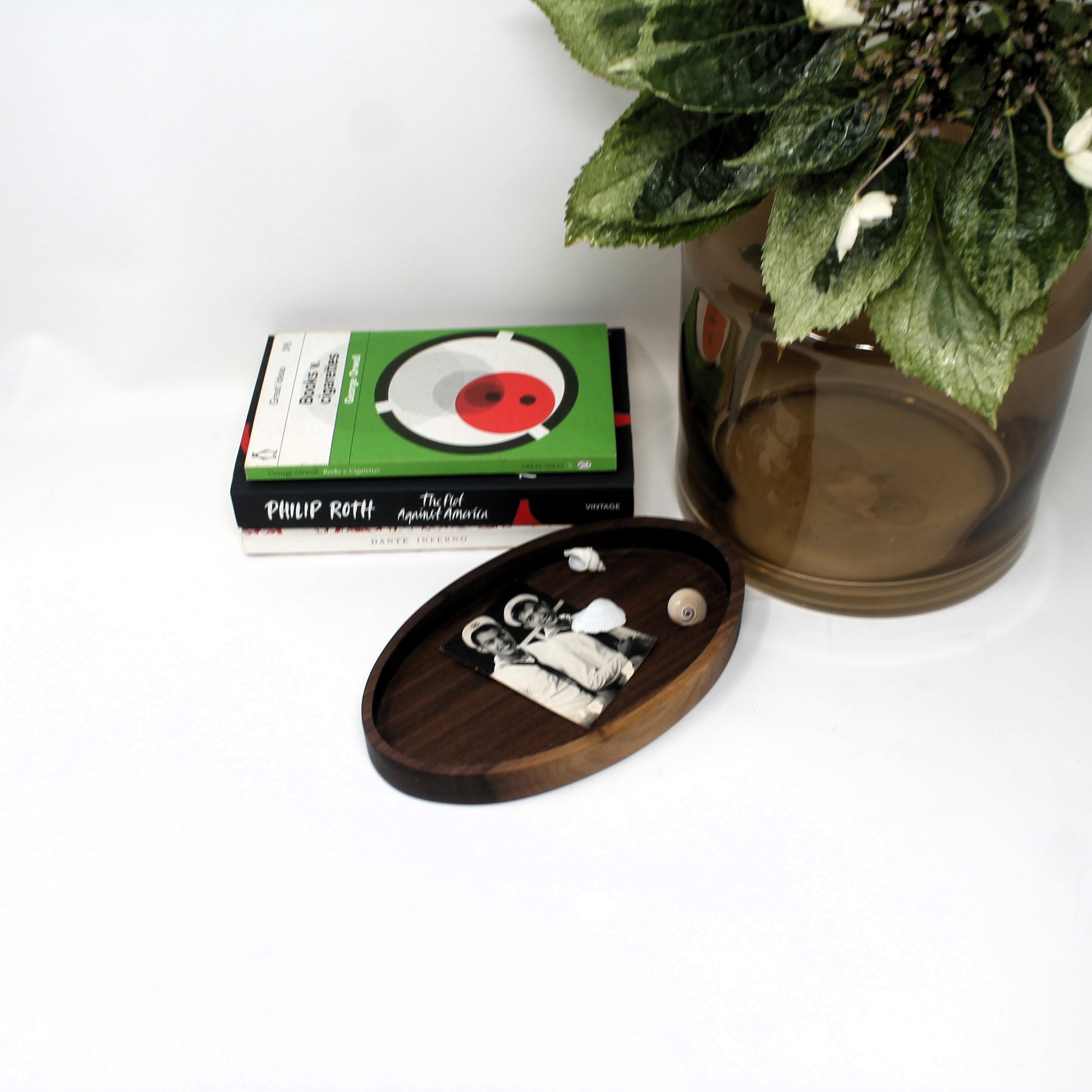 A Touch of Walnut Wonder: Elegance in the Palm of Your Hand Crafted from a single piece of rich American black walnut, this oval tray is a celebration of natural luxury in its purest form. Its smooth, sculptural lines and warm, lustrous grain make each one utterly unique—an heirloom in miniature. Designed with a subtle rebated base for seamless stacking, it's as practical as it is beautiful.