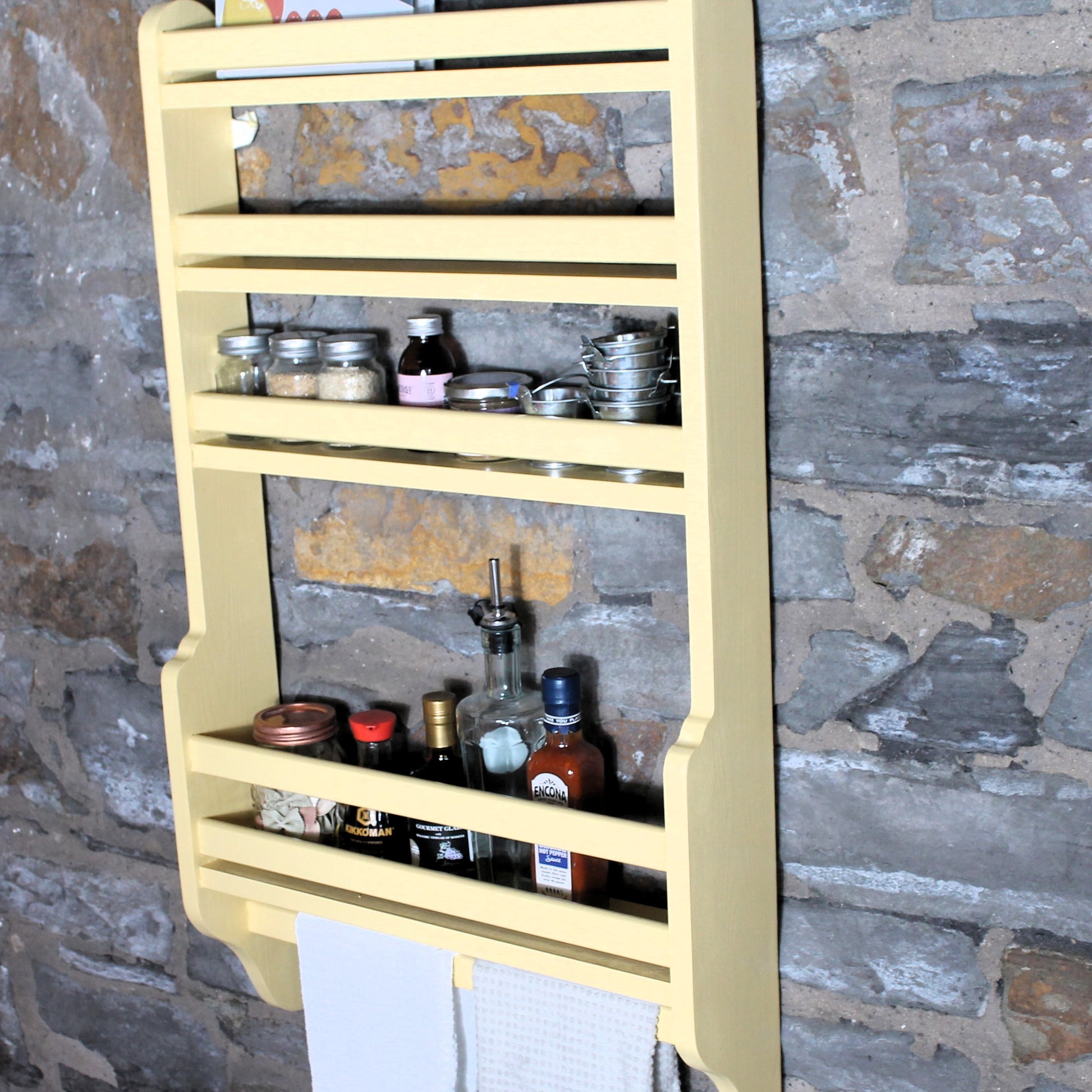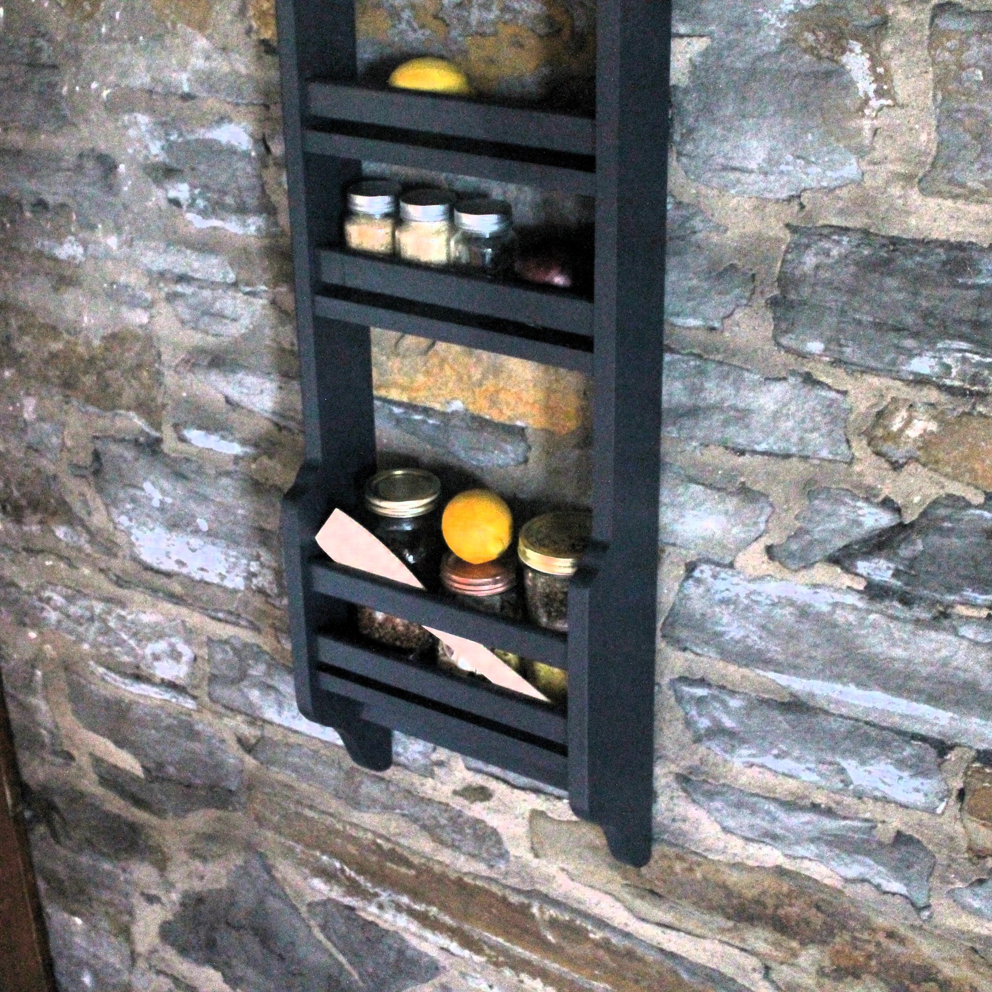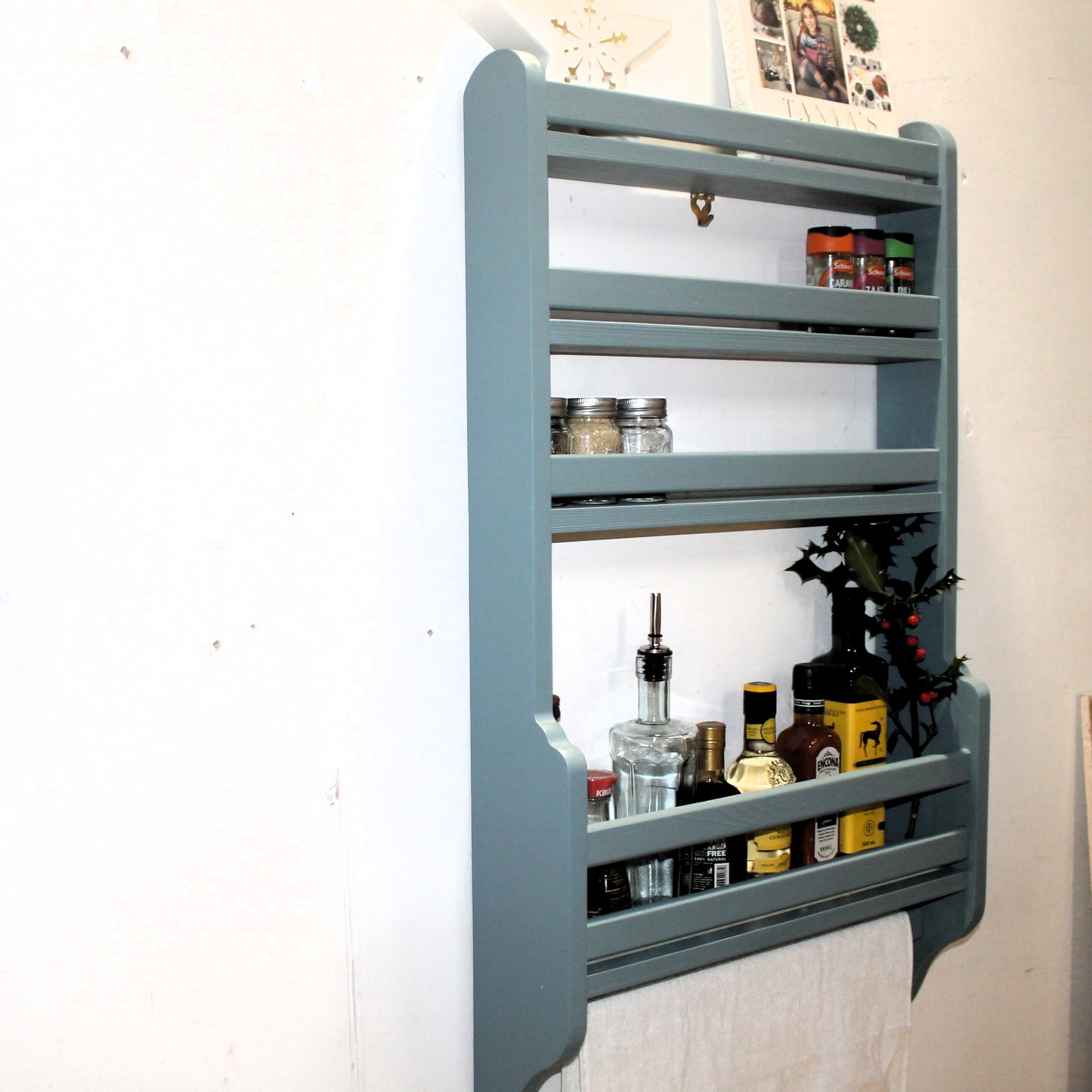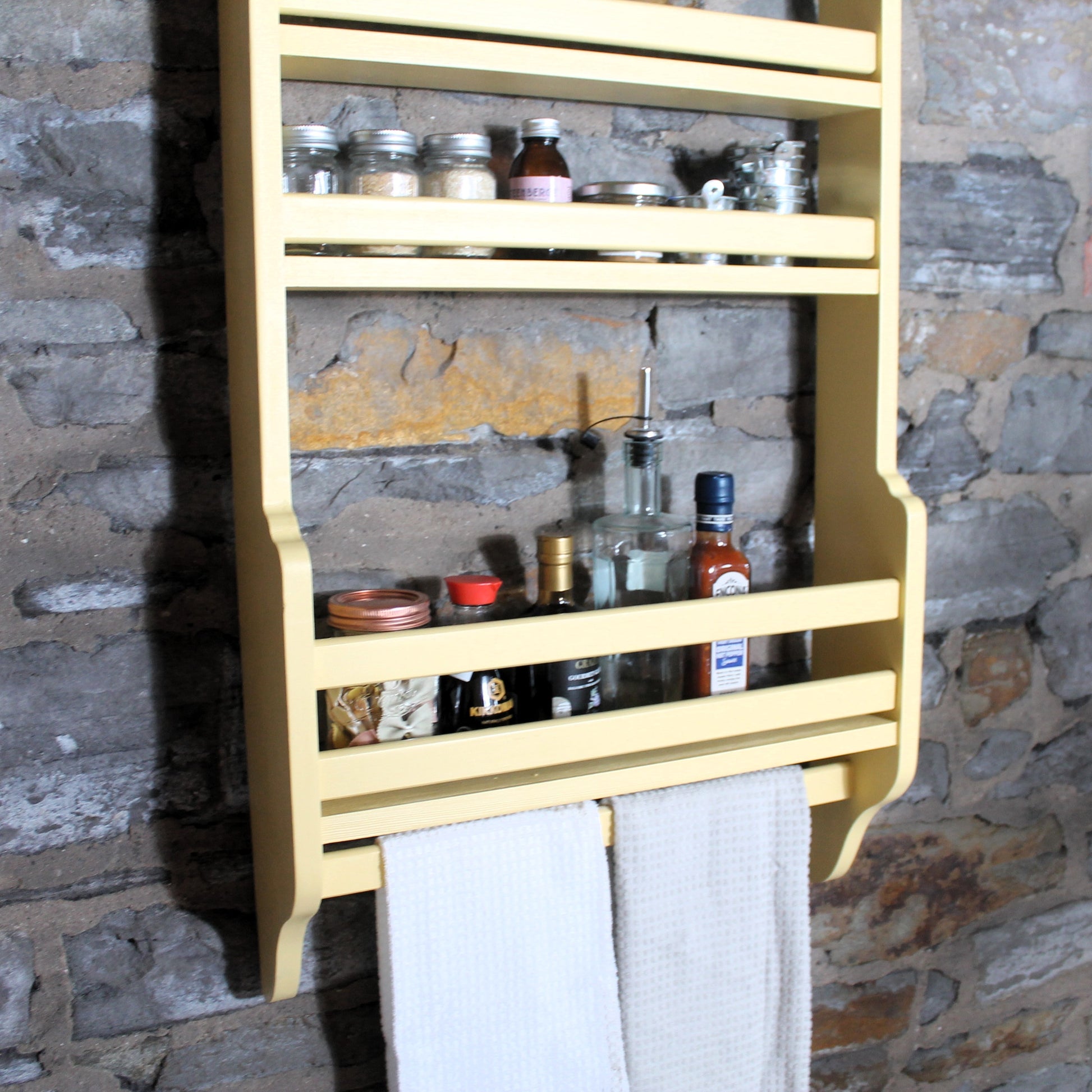 Have all your essentials within reach while cooking with this functional solid wood spice and bottle rack. The bottom shelf offers ample space for bottles, while the upper shelves are narrower, perfectly accommodating Schwartz jars (or similar) or mini Kilner jars. This spice rack comes in natural pine, oiled, or painted finishes.