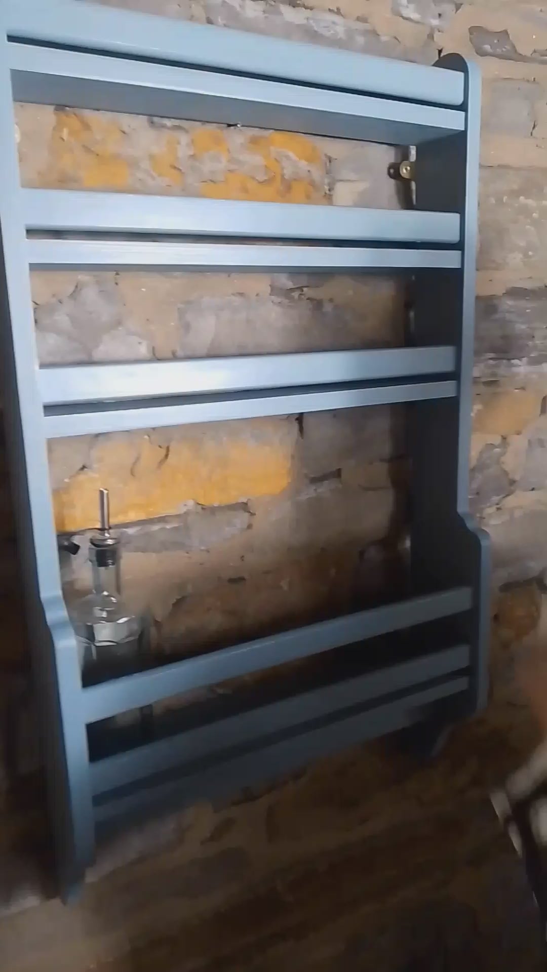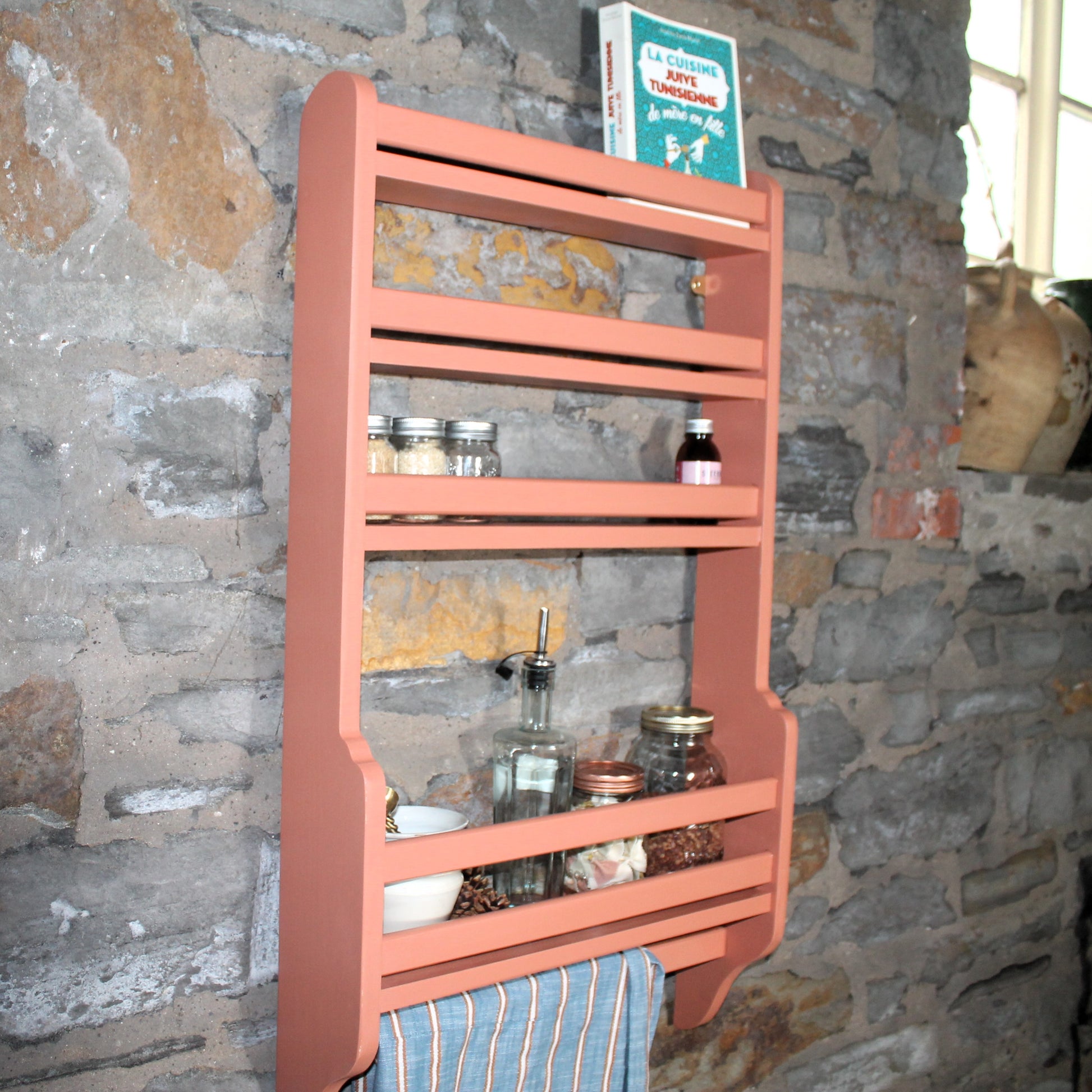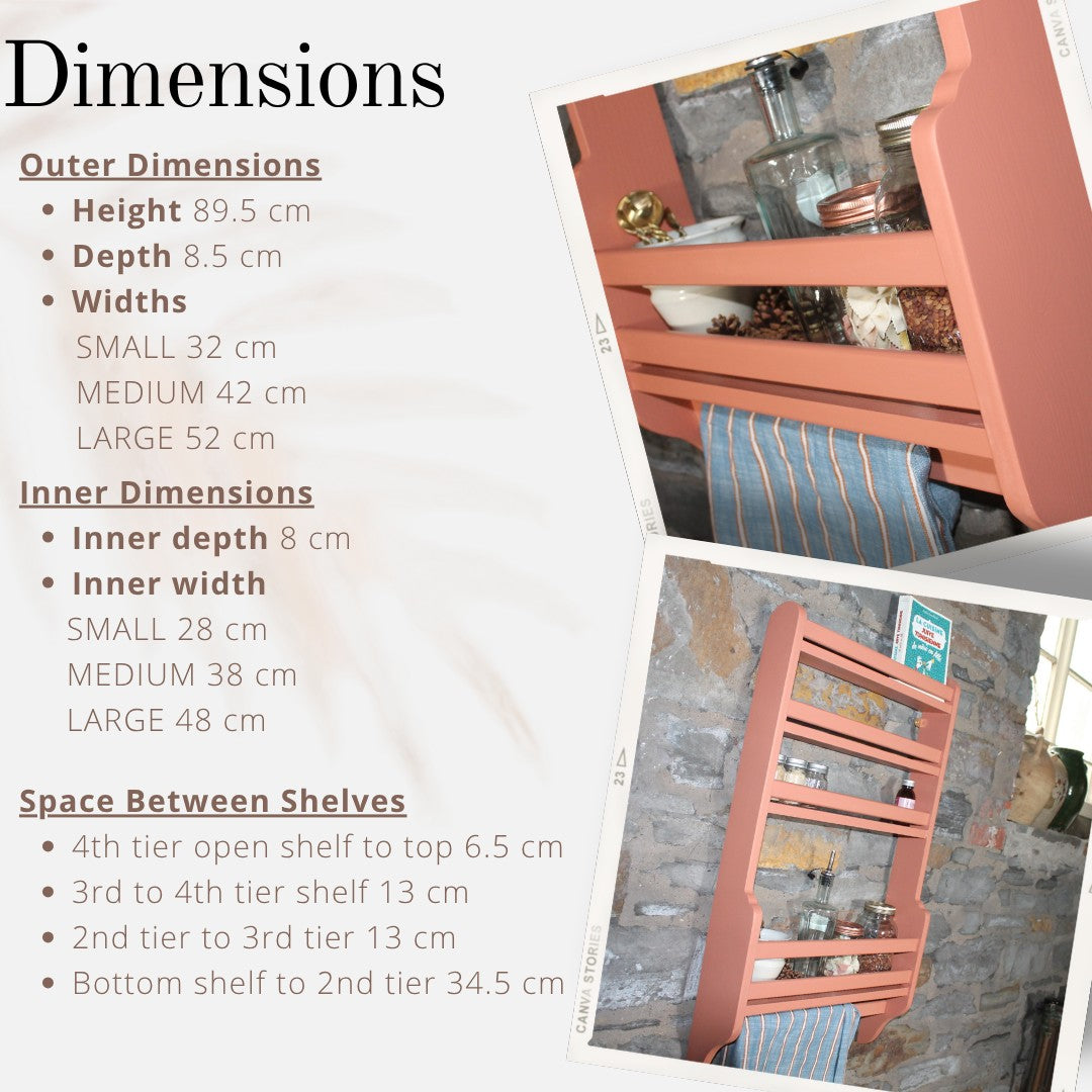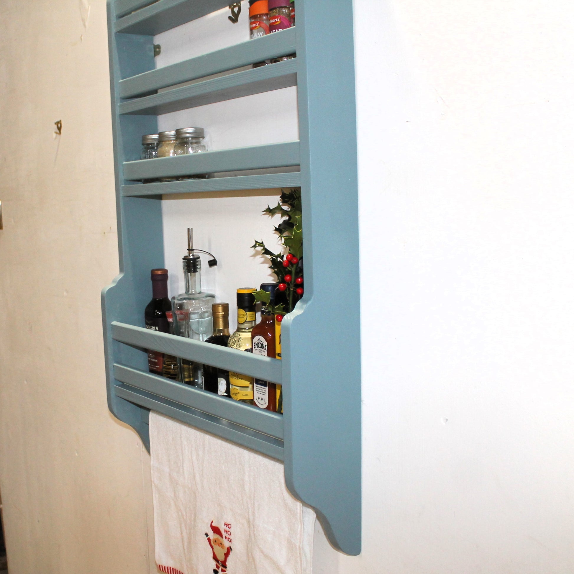 Have all your essentials within reach while cooking with this functional solid wood spice and bottle rack. The bottom shelf offers ample space for bottles, while the upper shelves are narrower, perfectly accommodating Schwartz jars (or similar) or mini Kilner jars. This spice rack comes in natural pine, oiled, or painted finishes.